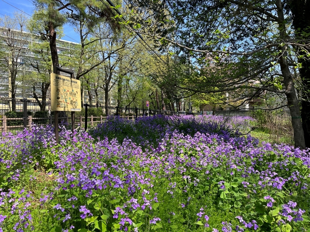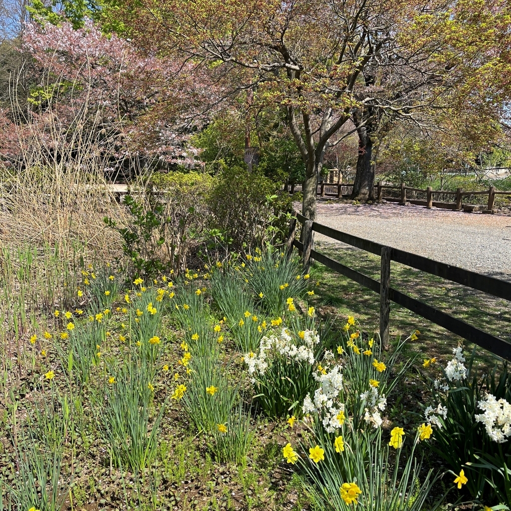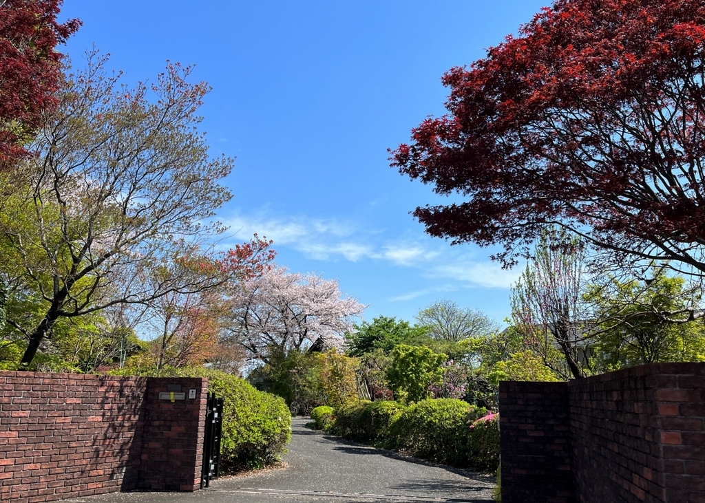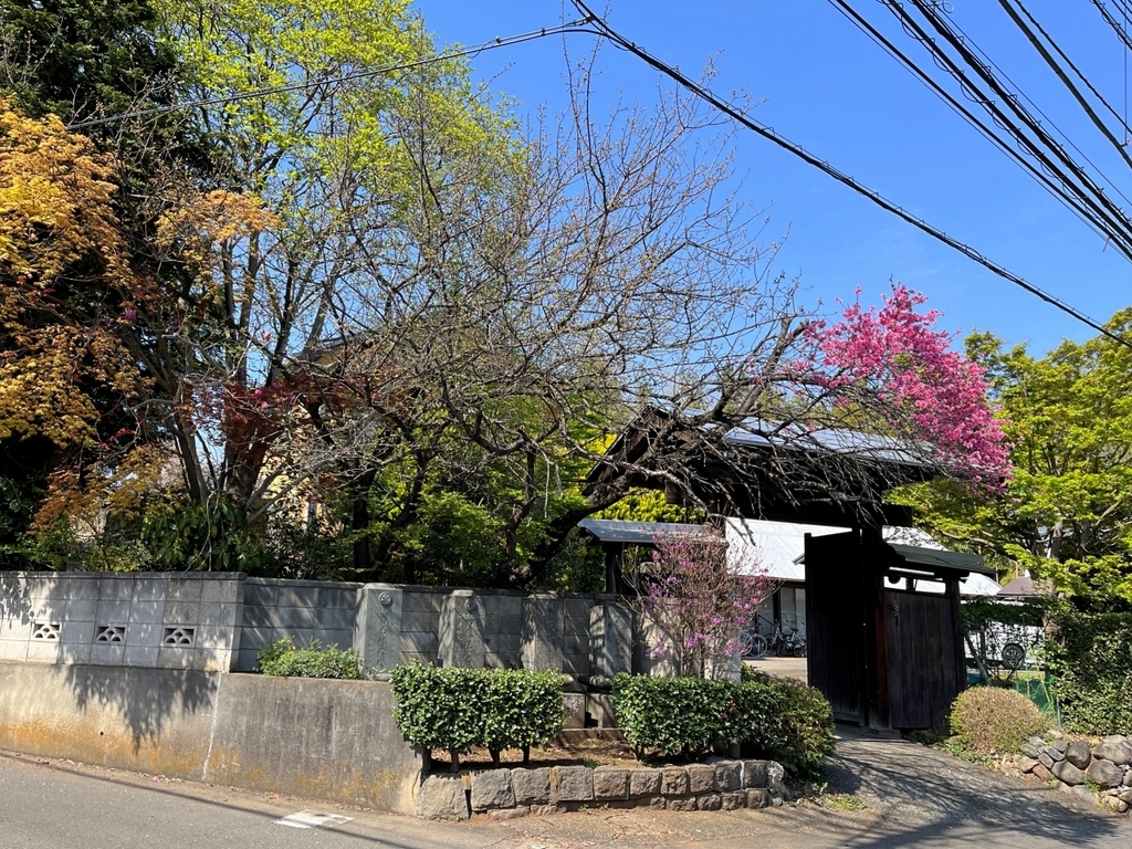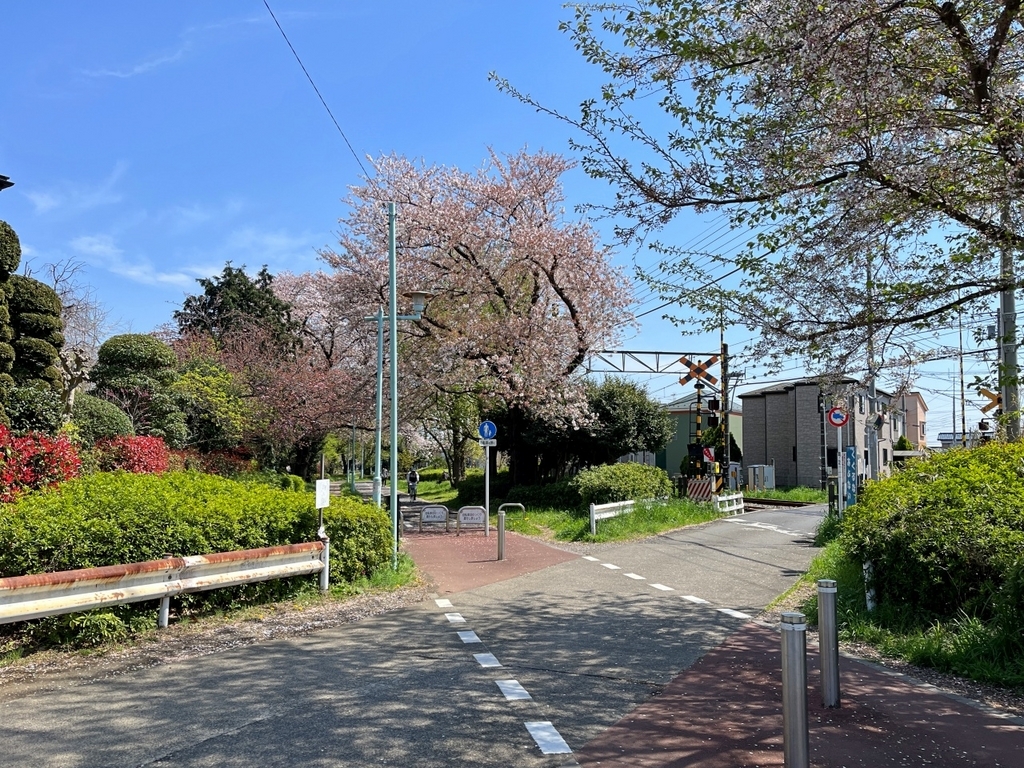 桜の向こうを走るのは西武西武園線、その奥新緑の森は『八国山緑地』。ただし線路を渡れないので迂回しないと行けません。