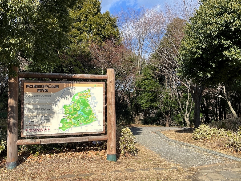 地図上は一直線だけどこんな凸凹の道を進んで行くと座間谷戸山公園につきあたります。